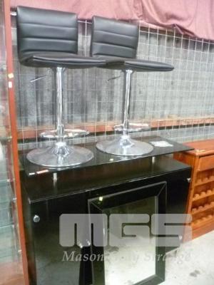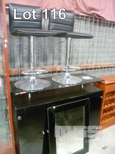 BLACK TIMBER LAMINATE SIDEBOARD, 4 x GLAZED DOORS, GLASS TOP SHELF, 121cm (L), PAIR ADJUSTABLE BAR STOOLS, BLACK VINYL, CHROME BASE & BLACK GLOSS FRAMED WALL MIRROR
