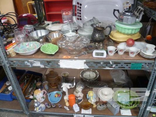 ASSORTED COLLECTABLES INC ENGLISH CHINA, TUPPERWARE, ETC, 2 x SHELVES
