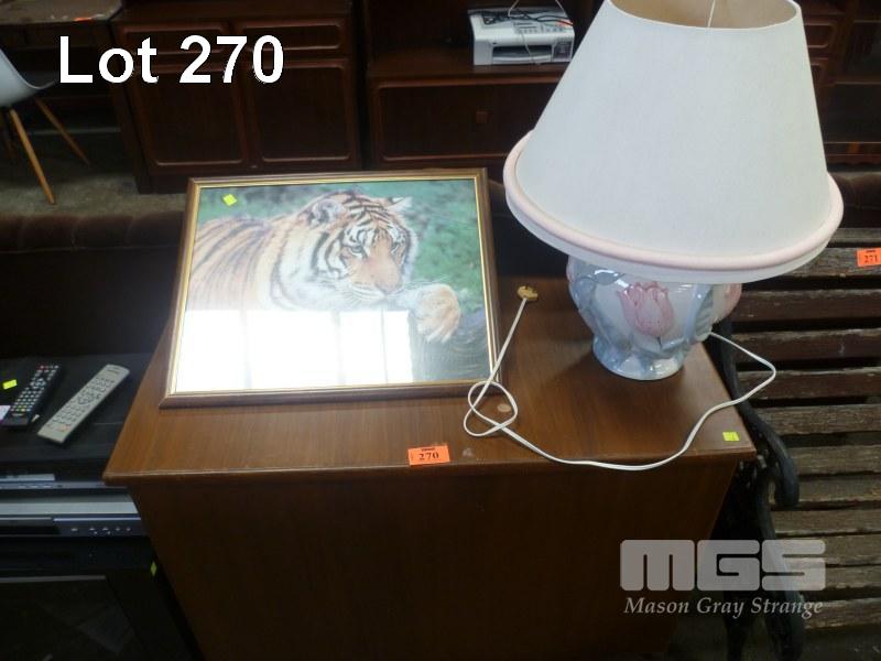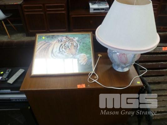 LINEN CHEST, "SAYWELL" TABLE LAMP AND FRAMED PICTURE OF TIGER