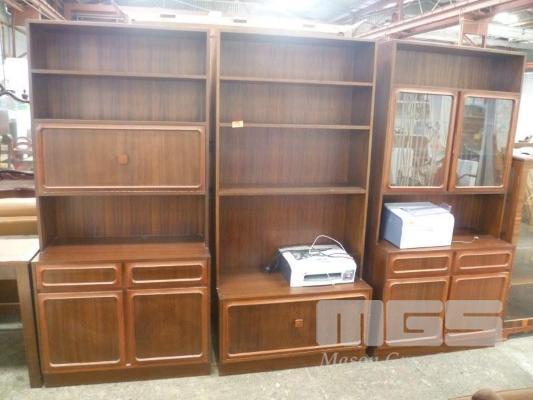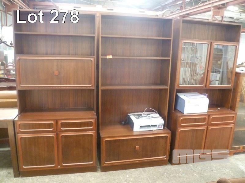 3 x MID CENTURY MODULAR 3 PIECE WALL UNIT COMPRISING BOOKSHELVES, COCKTAIL CABINET, DISPLAY CABINET, DRAWERS AND UNDER STORAGE.