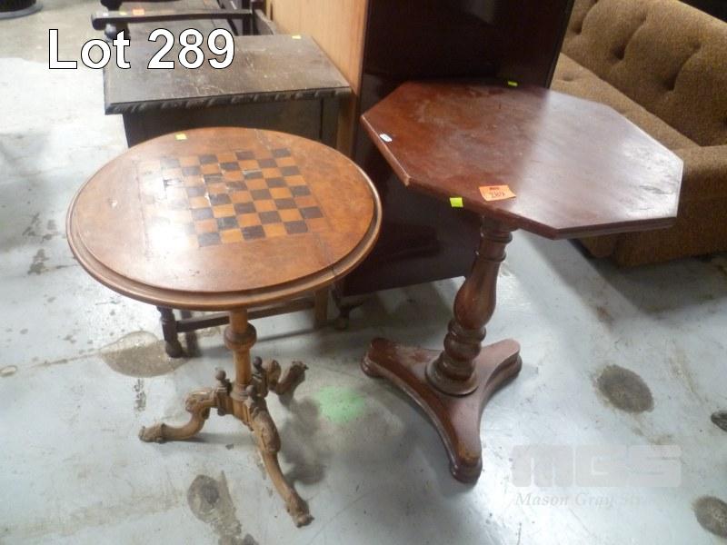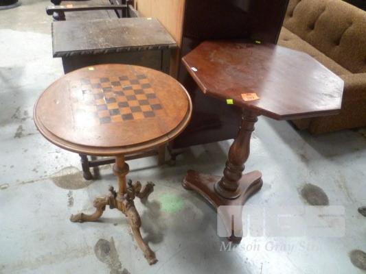 VINTAGE CHESS TABLE, BURL WALNUT VENEER TOP, SINGLE PEDESTAL WITH OCTAGONAL MAHOGANY OCCASIONAL TABLE, SINGLE PEDESTAL