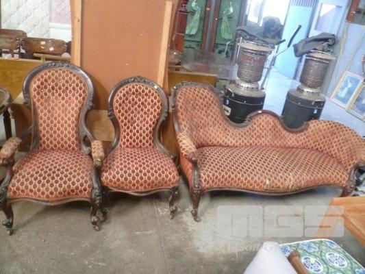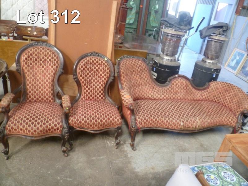 VINTAGE LOVERS LOUNGE, ORNATE TIMBER FRAME, RED/BEIGE VELVET WITH MATCHING GRANDFATHER & GRANDMOTHER CHAIRS
