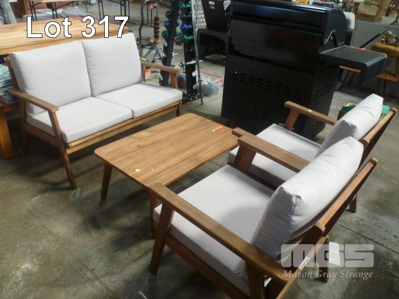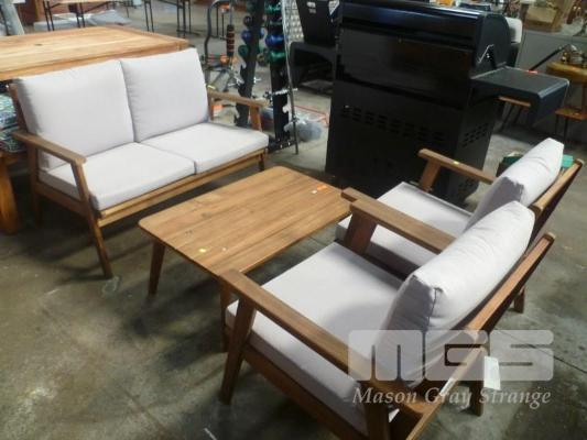 TIMBER 4 PIECE OUTDOOR SETTING INC 2 SEATER, 2 x ARM CHAIRS & COFFEE TABLE
