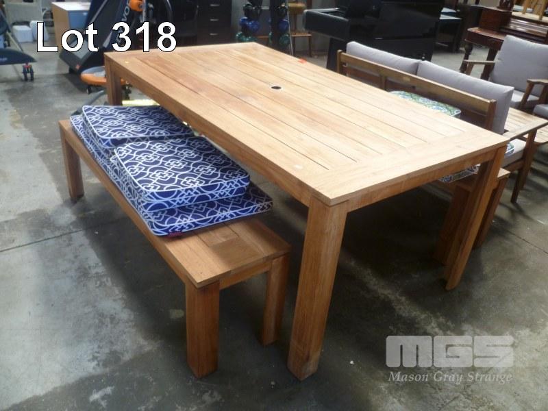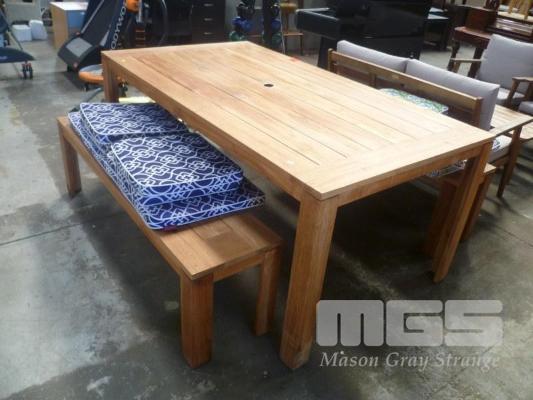 PINE PATIO SETTING INC RECTANGULAR TABLE, 2 x BENCH SEATS WITH PADDED CUSHIONS