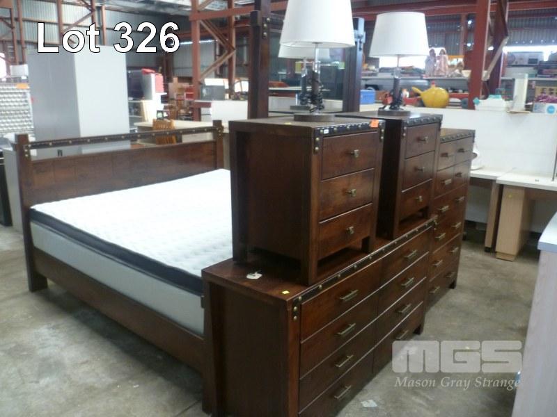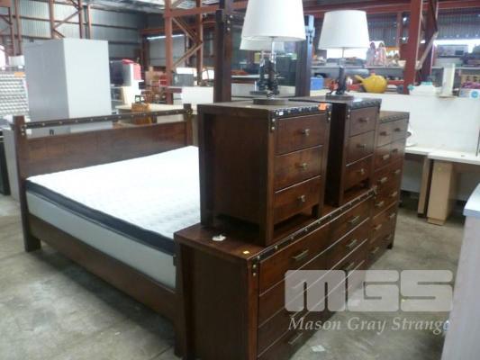 TIMBER GOTHIC STYLE 5PIECE BEDROOM SUITE, INC SUPER KING SIZE BED WITH SINGLE PILLOW TOP MATTRESS, PAIR OF BEDSIDE CABINET, TALLBOY CHEST DRESSER & PAIR TABLE LAMPS
