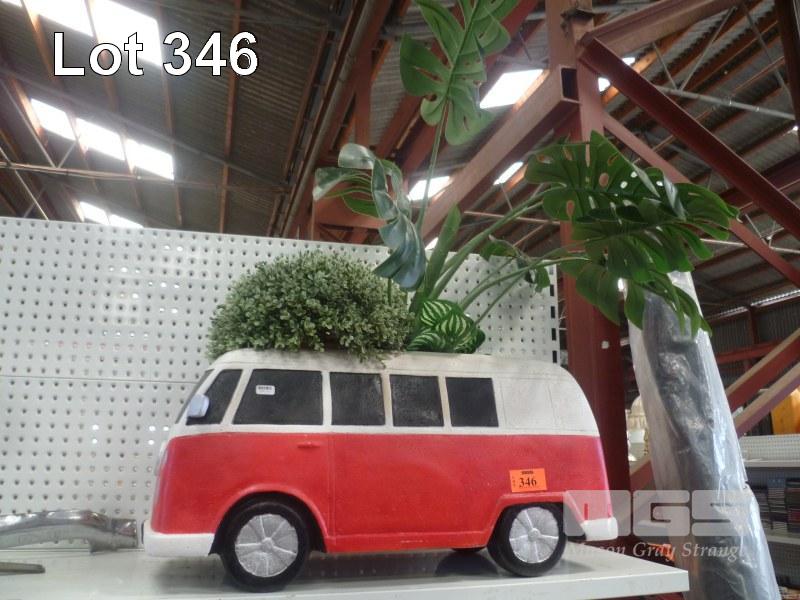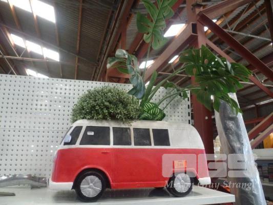RED/WHITE FIBREGLASS VW COMBI PLANTER BOX WITH ARTIFICIAL PLANTS