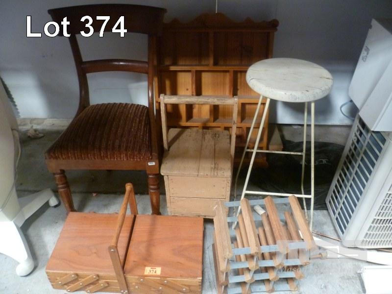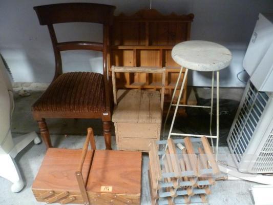 TIMBER BITS, MID 1800'S CHAIR, STOOL, CANTILEVER SEWING BOX, PIGEON HOLE WALL UNIT, SHOE SHINE, SINE RACK, ETC