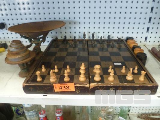 VINTAGE CAST SCALES & WEIGHTS & CHESS/DRAUGHT SET, COMPLETE