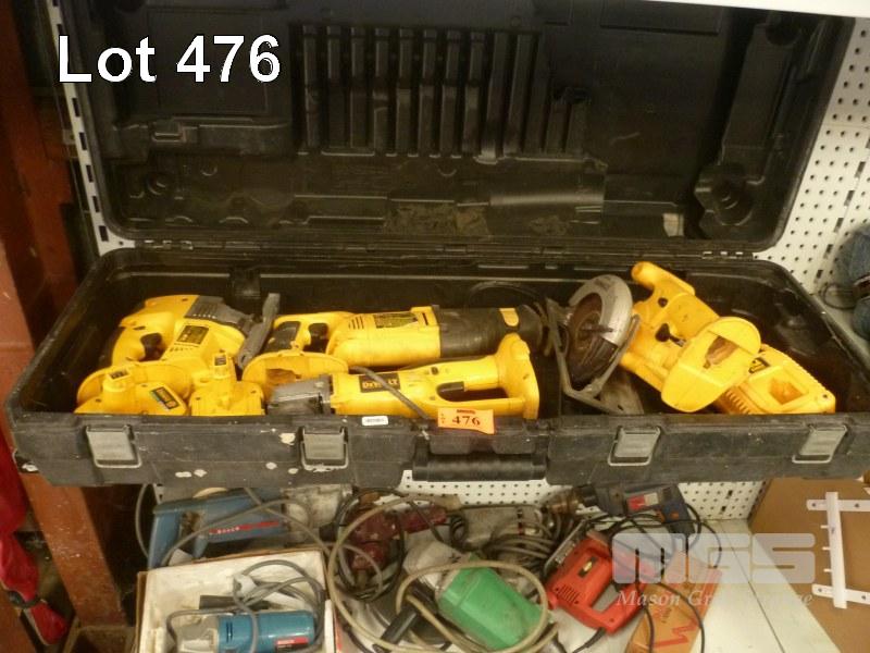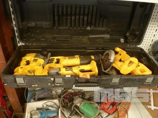 DEWALT CORDLESS TOOLS INC JIGSAW, ANGLE GRINDER, RECIPROCATING SAW, 136cmm TRIM SAW, CHARGER & 2 x BATTERIES IN CARRY CASE