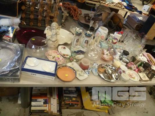 COLLECTION OF HOMEWARES INCLUDING TRAYS, PLATES, ORNAMENTAL VASES, GLASSWARE, STATUETTE, CANDLES, SOAPS, FIGURINES, TRINKETS AND MORE