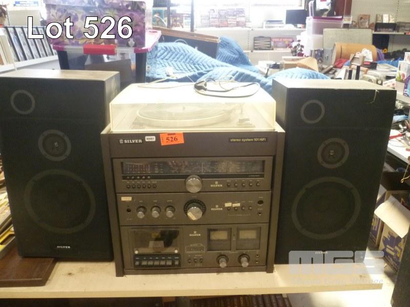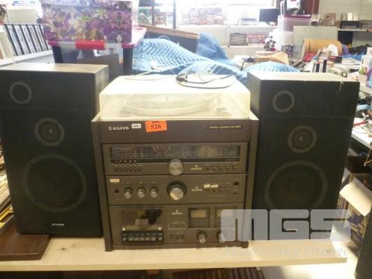 SILVER RADIO/CASSETTE & TURNTABLE STEREO SYSTEM WITH 2 x SPEAKERS