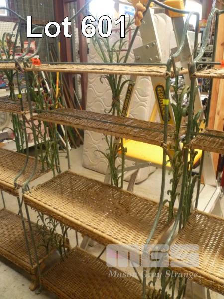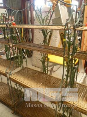 DISTRESSED GREEN, WROUGHT IRON & CANE DECORATIVE 4 TIER FRAME PLANTER STAND, WITH FLORAL FEATURES