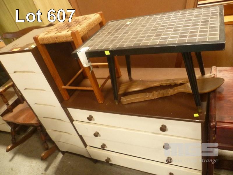 LOWLINE CHEST 4 DRAWERS, NARROW TALL BOY, 7 DRAWER, TILE TOP SIDE TABLE & PLANTER STAND