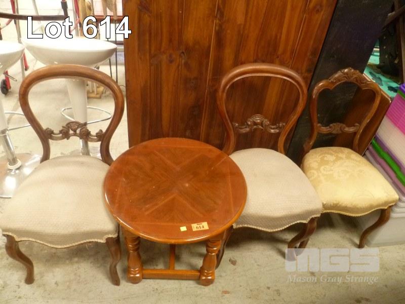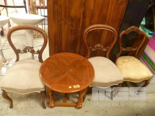 3 X ANTIQUE BALLOON BACKED DINING CHAIRS & MARQUETRY CIRCULAR TABLE