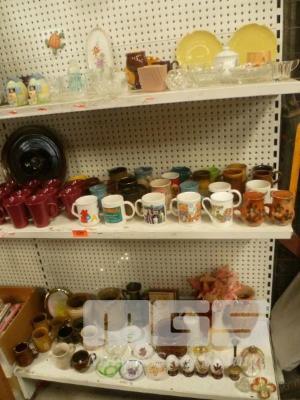 GLASS & CERAMICWARE, INC GREEN GLASS, COLLECTABLE EGGS, PLATES, MUGS, ETC, 3 x SHELVES