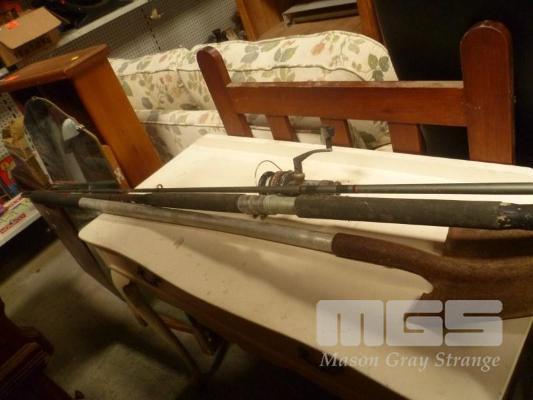 WHITE PAINTED, TIMBER HALL TABLE, TIMBER SIDE CABINET, CD TOWER, MIRROR, SPADE & FISHING ROD