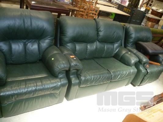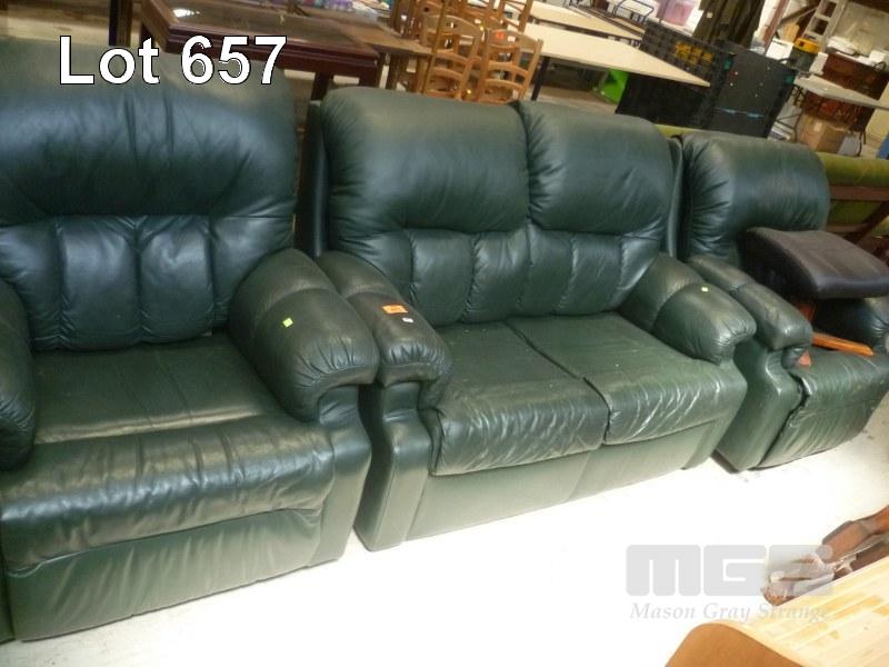 DARK GREEN LEATHER 3 PIECE LOUNGE SUITE INC 2 SEATER & 2 x RECLINERS WITH BLACK VINYL FOOT STOOL