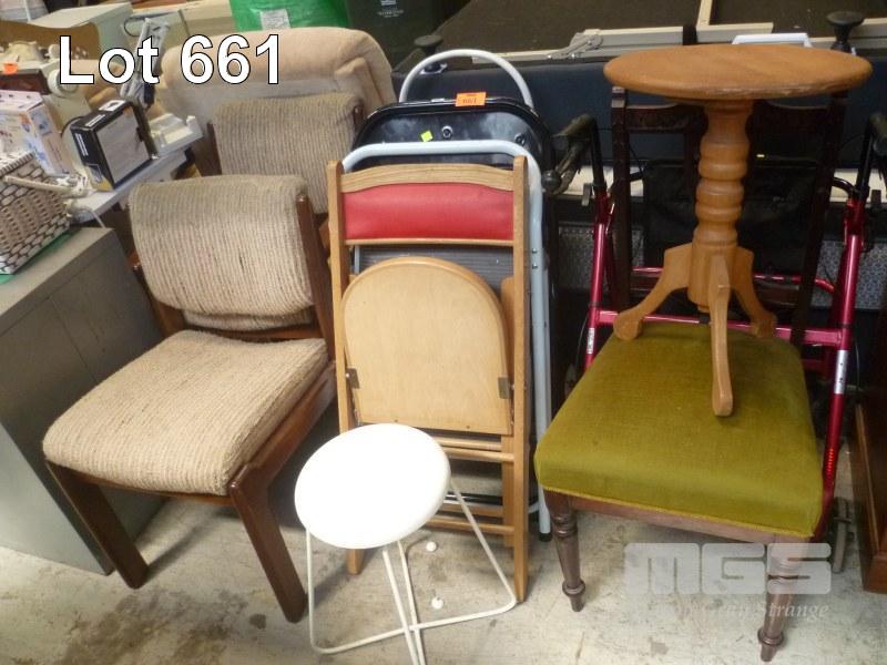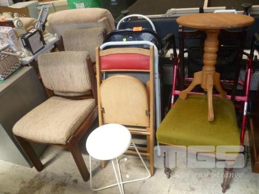 BLUE MOBILITY WALKER, DINING CHAIR, WINE TABLE, WHITE STOOL, SHOPPING TROLLEY, TIMBER & METAL FOLD UP CHAIRS, ARM CHAIR, STEP LADDER, ETC
