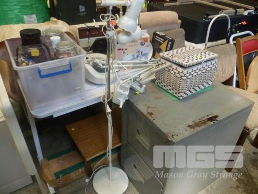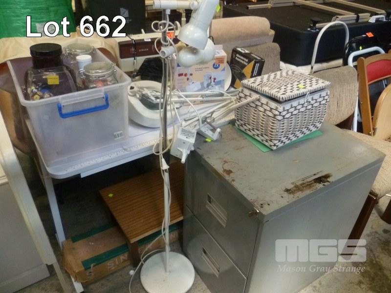SINGER SEWING MACHINE, SEWING TABLE, MAGNIFIER LAMP, SEWING ACCESSORIES, SINGER KNITTING MACHINE & 2 DRAWER FILING CABINET