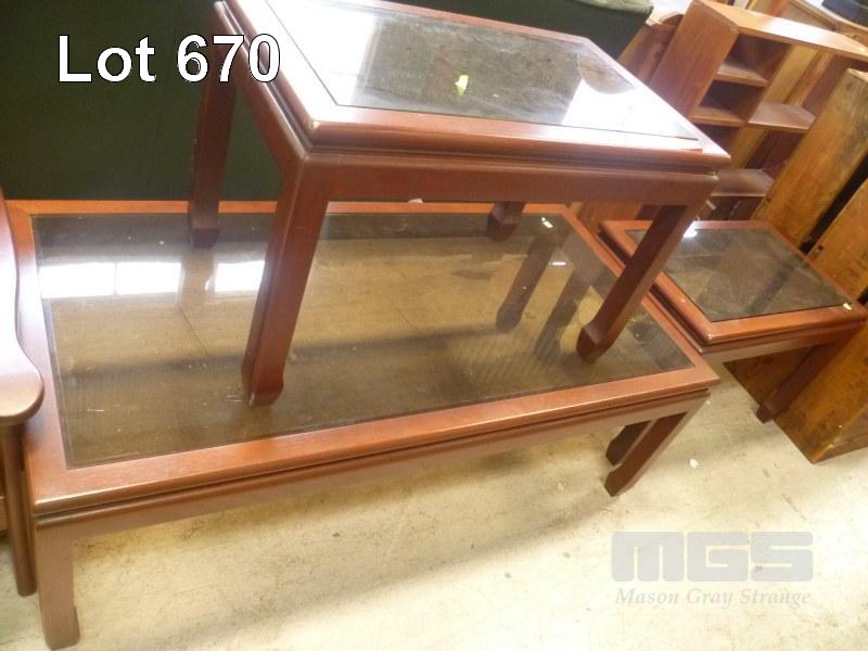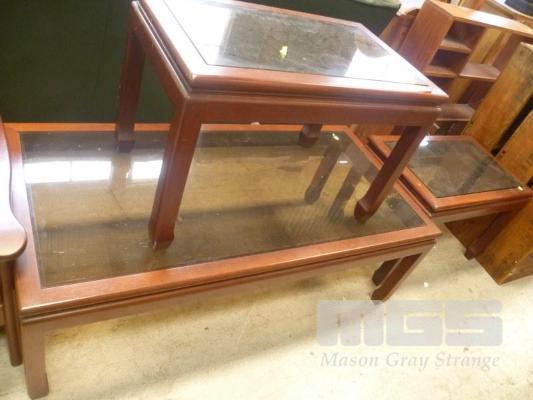 RECTANGULAR TIMBER FRAME, SMOKE GLASS TOPPED COFFEE TABLE & PAIR MATCHING SIDE TABLES