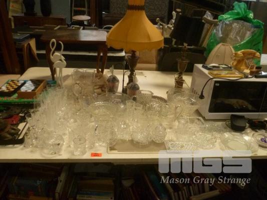 ASSORTED CRYSTAL/GLASSWARE, MICROWAVE, TABLE LAMPS, POT HOLDER, ETC, 1 x TABLE