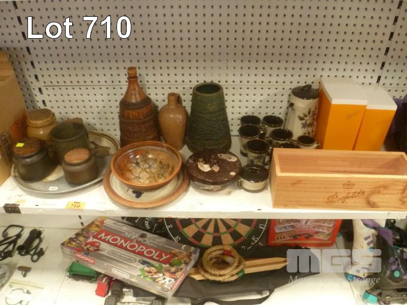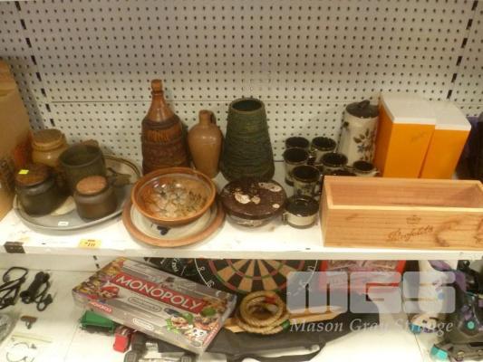 ASSORTED POTTERY, KITCHEN CANISTERS & PENFOLDS TIMBER CRATE
