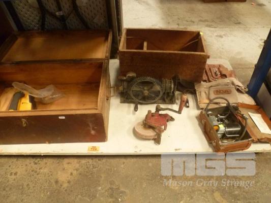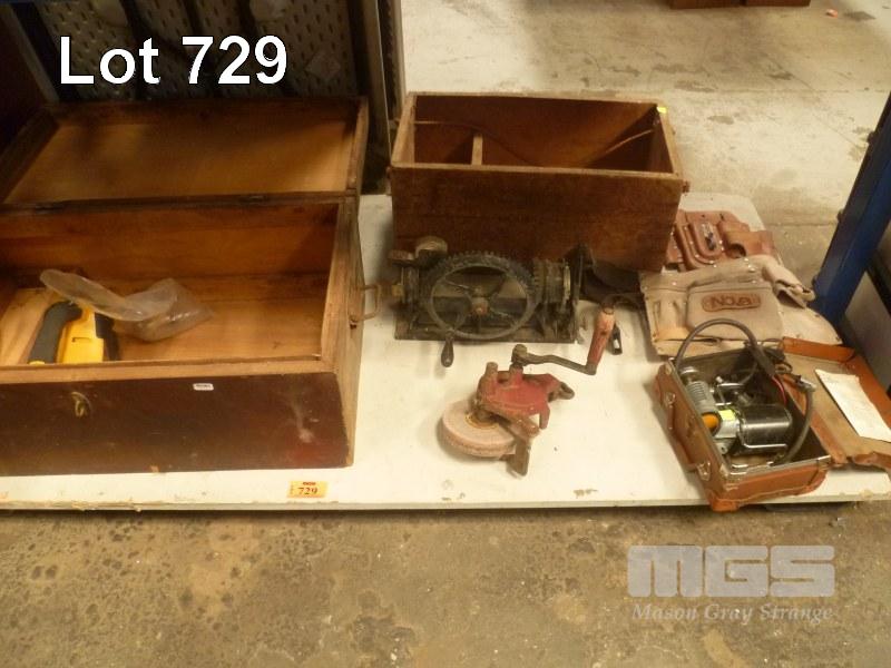 VINTAGE STAR WINDOW STAR SHADE CUTTER, VINTAGE GRINDER, WORK BELTS, TIMBER TOOL TRUNK, ETC