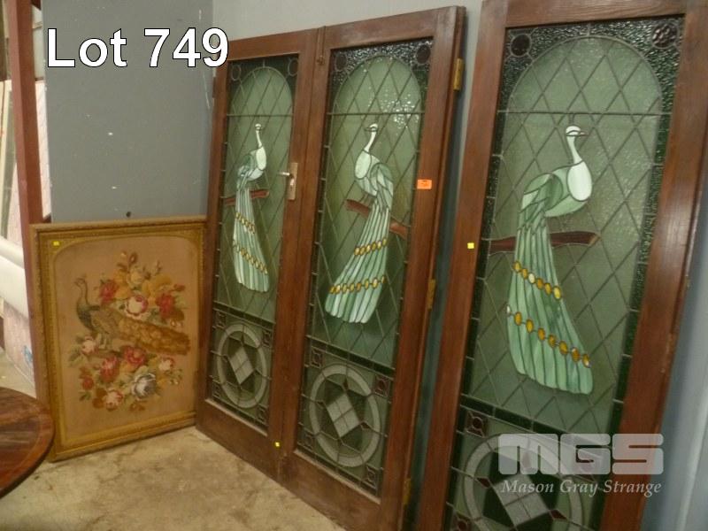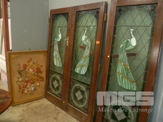 SET 3 ART DECO INTERNAL DOORS, PEACOCK LEADLIGHT DESIGN WITH FRAMED TAPESTRY OF PEACOCK