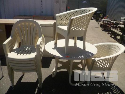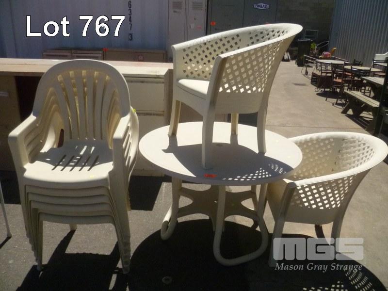 OUTDOOR SETTING, CIRCULAR TABLE & 2 X TUB CHAIRS & SET OF 6 X STACKABLE OUTDOOR CHAIRS