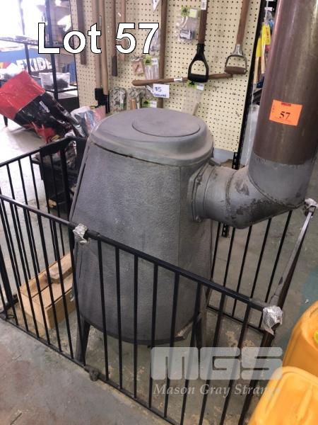 POT BELLY STOVE & FLUE KIT WITH FENCING AND ASH BUCKET.