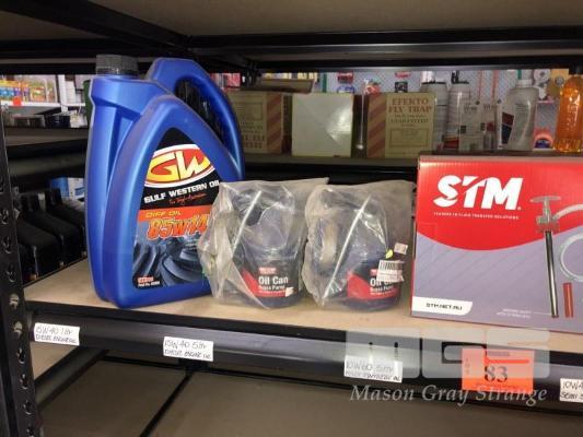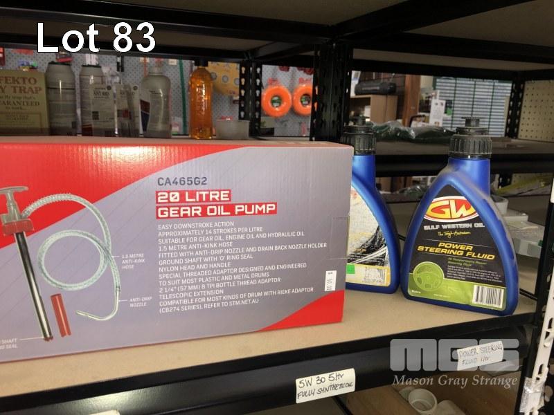 STM 20 LITRE GEAR OIL PUMP, 2 x OIL CANS, 2 x 1 LITRE POWER STEERING OILS & 1 x 5 LITRE 85W140 ENGINE OIL