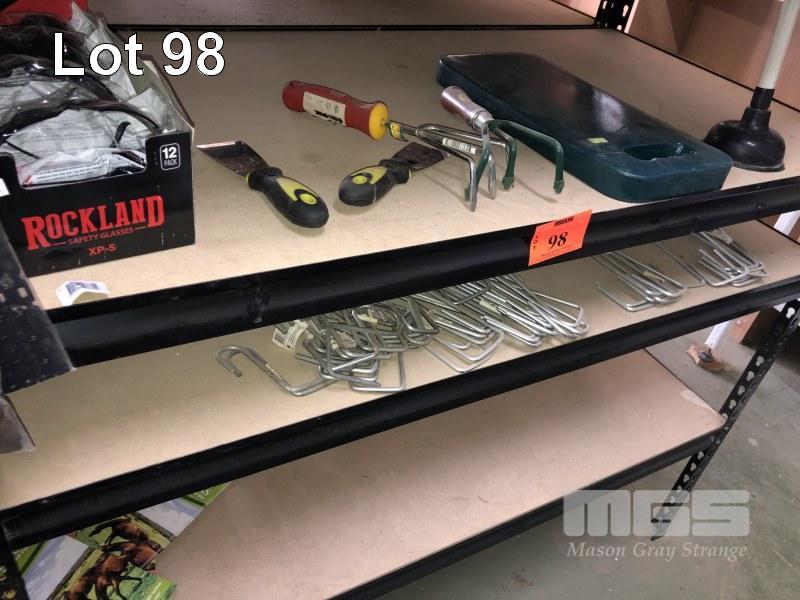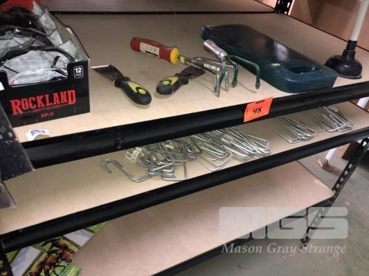 KNEELING PADS, SCRAPERS, SAFETY GLASSES, PLUNGER, HOOKS, ETC