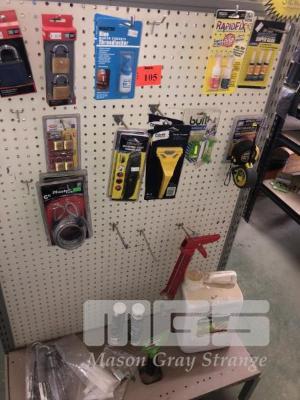 SHADOW BOARD OF PADLOCKS, KNIVES, SEALANTS, GLUES, LOCK WIRES, BOLSTER TAPES, APPLICATORS, 10 LITRE SHOGUN HERBICIDE