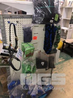 ROUND BALE NET, ASSORTED HAY BALE NETS, HALTER, HORSE FLY MASK CONTENTS PEGBOARD