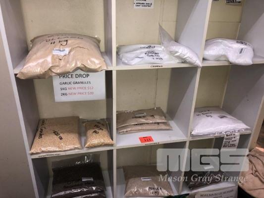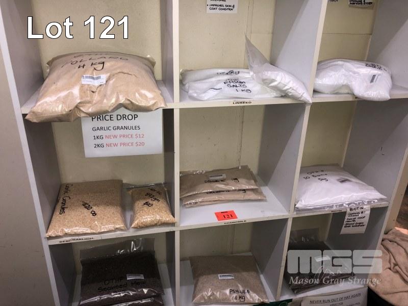 ASSORTED STOCK PRODUCTS, BIOTIN, DOLOMITE, PSYLLIUM, SEAWEED MEAL, PETER MENT LEAVES, GARLIC GRANULES, POLLARD EPSON SALTS, INCLUDES RACK