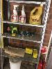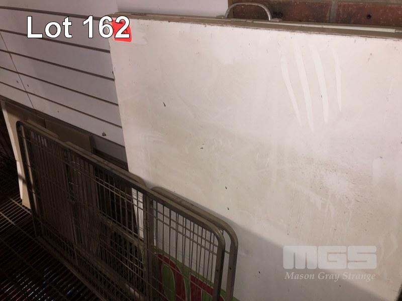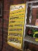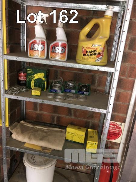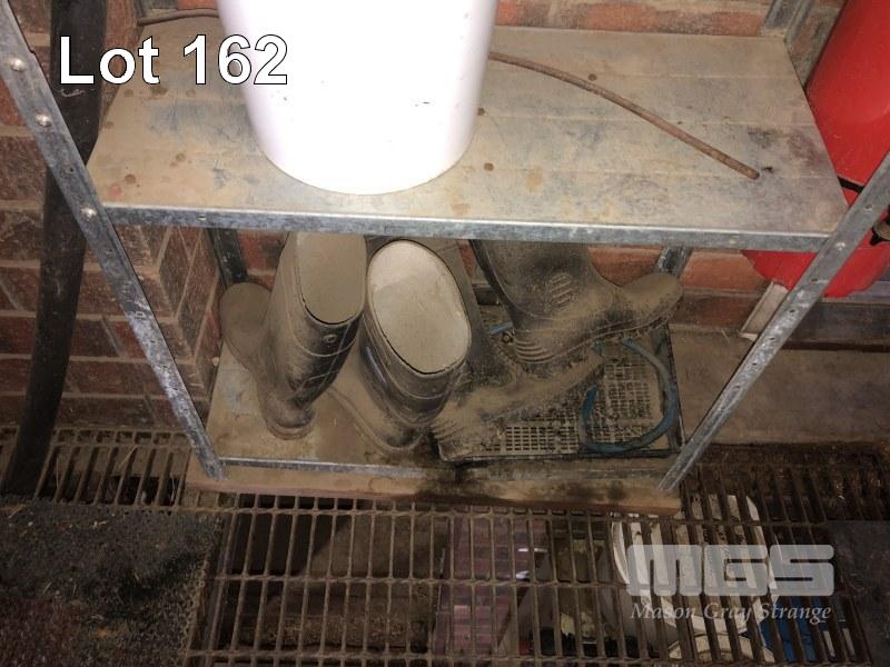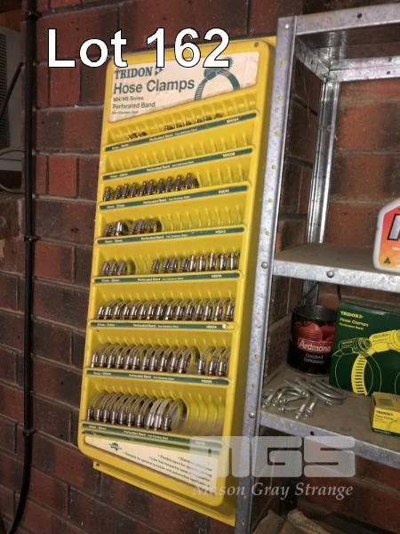 TRIDON WALL MOUNT HOSE CLAMP RACK & CLAMPS, 6 TIER GALV SHELF & CONTENTS, HAND CLEANER, CLAMPS, ETC, FOLD OUT A-FRAME SIGN, 2 x MESH PANELS, WIRE BASKET & 2 x PAIRS RUBBER BOOTS