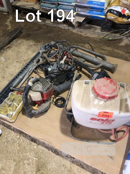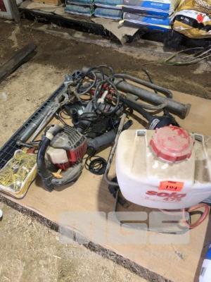 ASSORTED WORKSHOP TOOLS, ETC, BACKPACK SPRAY, GAS BOTTLE REFILL HOSES, HOMELITE PETROL BLOWER