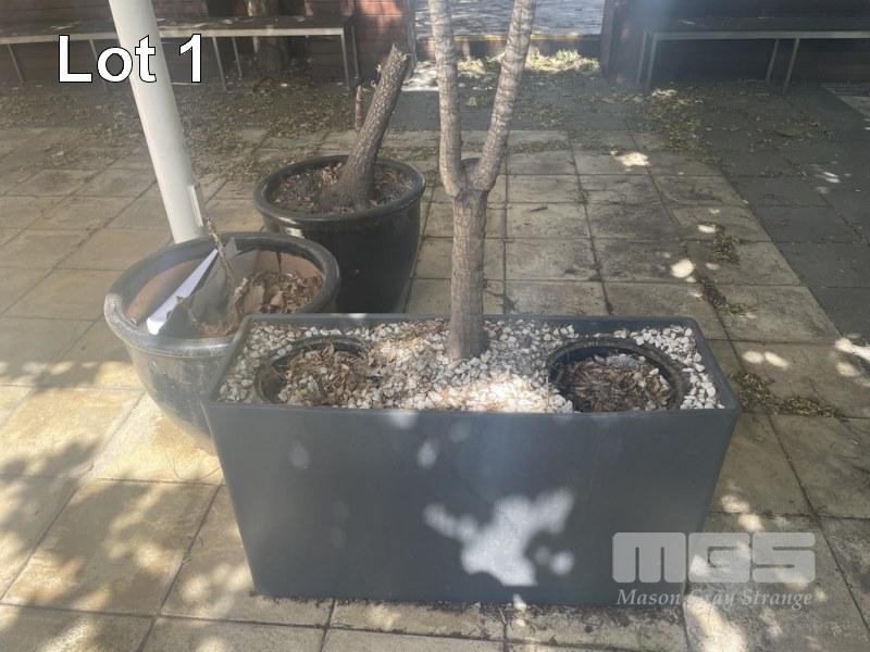 3 x BLACK CERAMIC GARDEN POTS, 60cm DIAMETER & 2 x RECTANGULAR PLANTERS