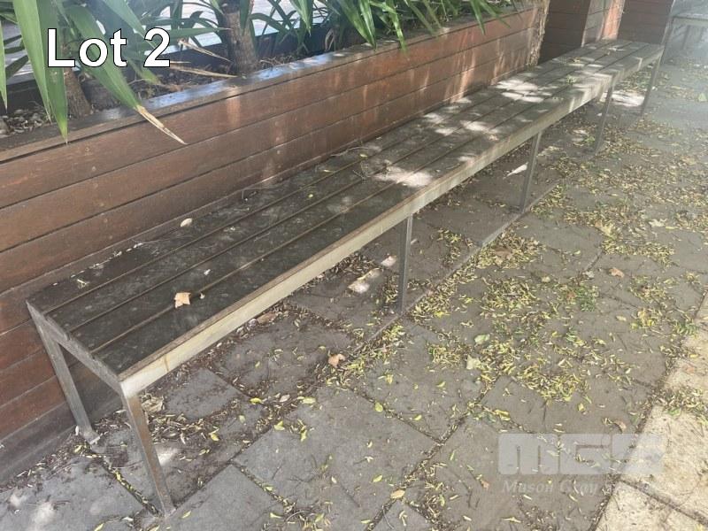 3 x CORNER BENCH SEATS, SLATTED TIMBER & STAINLESS STEEL, APPROX 2 x 2m LONG BENCH SEAT 4m, (BOLTED TO PAVERS)