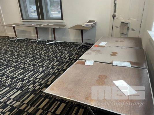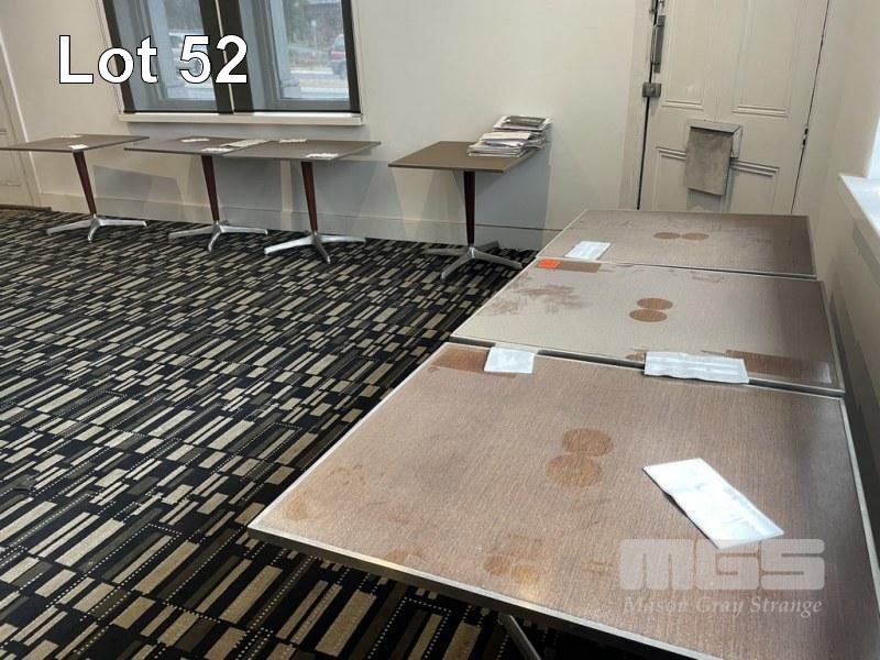 7 x DINING TABLES, 88 x 73cm, TIMBER VENEER, ALUMINIUM EDGING, TIMBER & CHROME PEDESTAL BASE