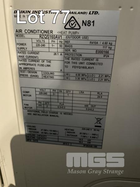 DAIKIN AIRCONDITIONER, MOD: RZQS160AV1 DOM: 2015 WITH DUCTING & HEAT PUMP MOD: FDYQ160LAV1