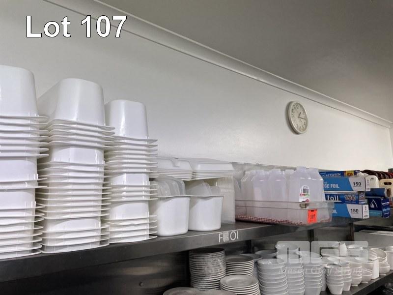 QUANTITY PVC TUBS, SAUCE BOTTLES, FOIL, FREEZER FILM, BAKING PAPER & WRAP (TOP SHELF)