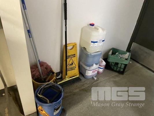 ASSORTED CLEANING PRODUCTS, MOPS, BROOMS, ETC