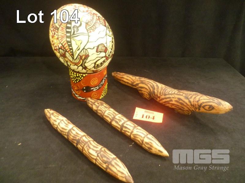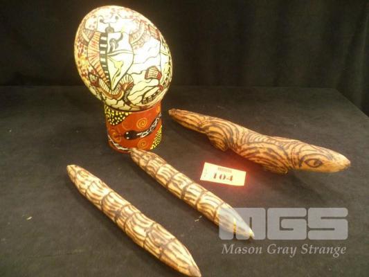 PAINTED EMU EGG, TAPPING STICKS & GOANNA