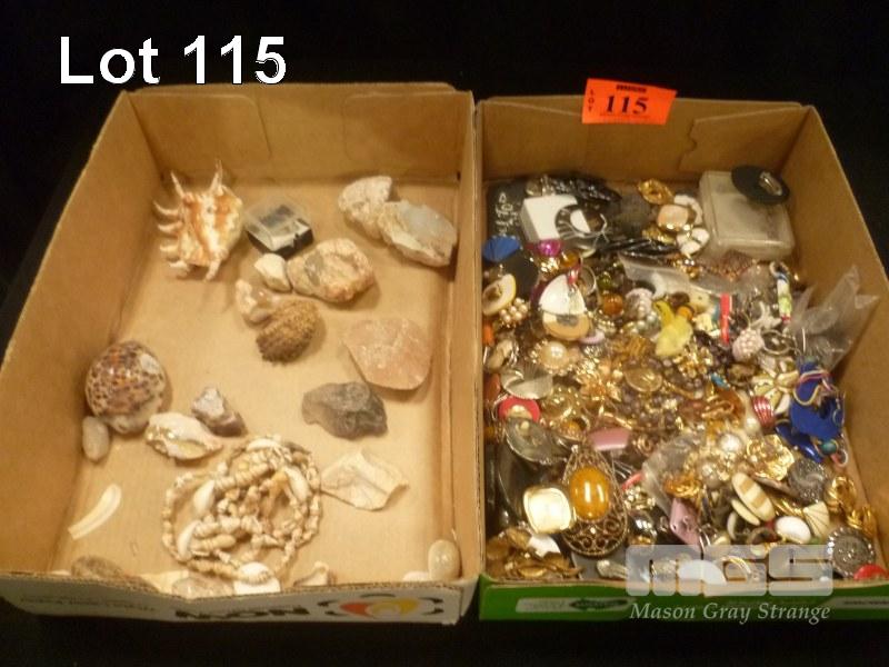 ASSORTED DRESS JEWELLERY, SEA SHELLS, MINERAL SPECIMENS, ETC