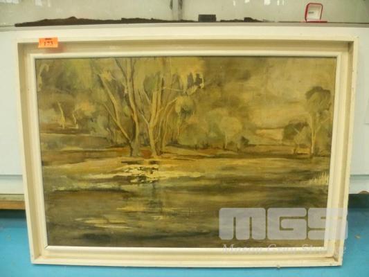 FRAMED OIL ON BOARD, BESIDE THE STILL WATERS, ECHUNGA SA BY MARJORIE NELSON, 1968