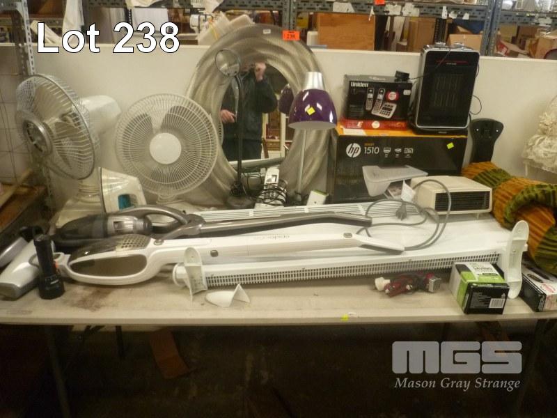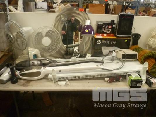 HEATERS, DESK FANS, TABLE LAMPS, ETC, 1 x TABLE