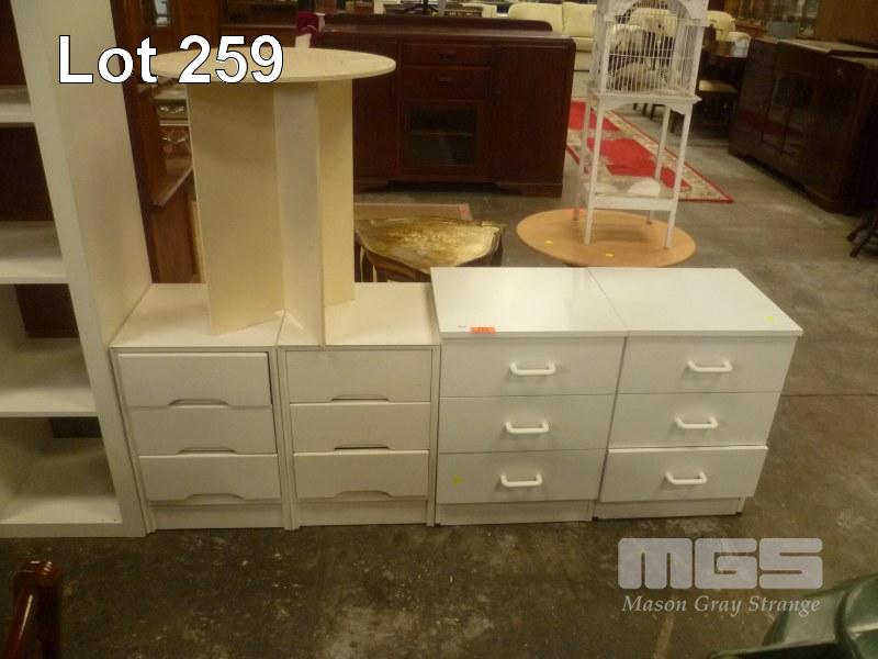 2 x PAIRS BEDSIDE CABINETS, WHITE PAINTED & WHITE LAMINATE WITH MDF OCCASIONAL ROUND TABLE
