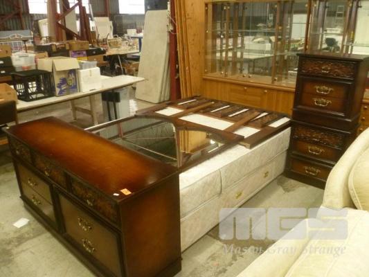 TIMBER VENEER 5 PIECE BEDROOM SUITE, BRAS HANDLES, ORNATE CARVING INC QUEEN SIZE ENSEMBLE WITH UNDERSTORAGE, 7 DRAWER DRESSER, BEDHEAD & PAIR BEDSIDE CABINETS