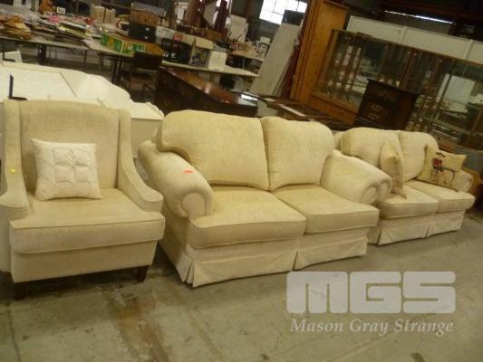 PAIR 2.5 SEATER LOUNGES, LIGHT BEIGE, ROLL ARM WITH LIGHT BEIGE ARM CHAIRS, 1 x LEG REQUIRES REPAIR
